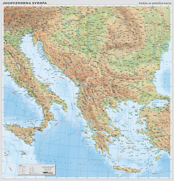 Stenska karta Jugovzhodne Evrope, primerna za montažno na steno, ali uporabo na stojalu.